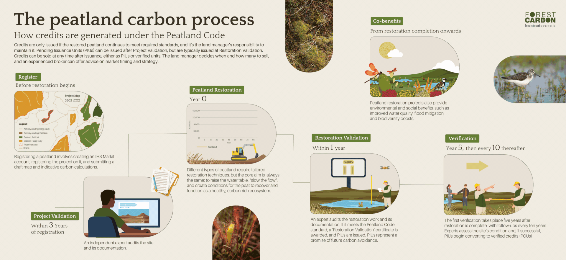 Each infographic was structured as a clear, time-based journey, showing how woodland and peatland projects evolve and generate carbon credits as they progress through key verification stages.
